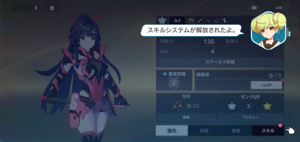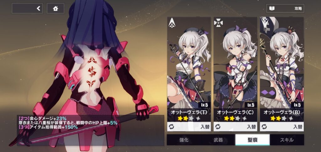 戦闘経験値や育成素材でレベルを上昇、武器と「聖痕(せいこん)」を装着してステータスUP!そして、スキルレベルを上げて性能を強化していきましょう
